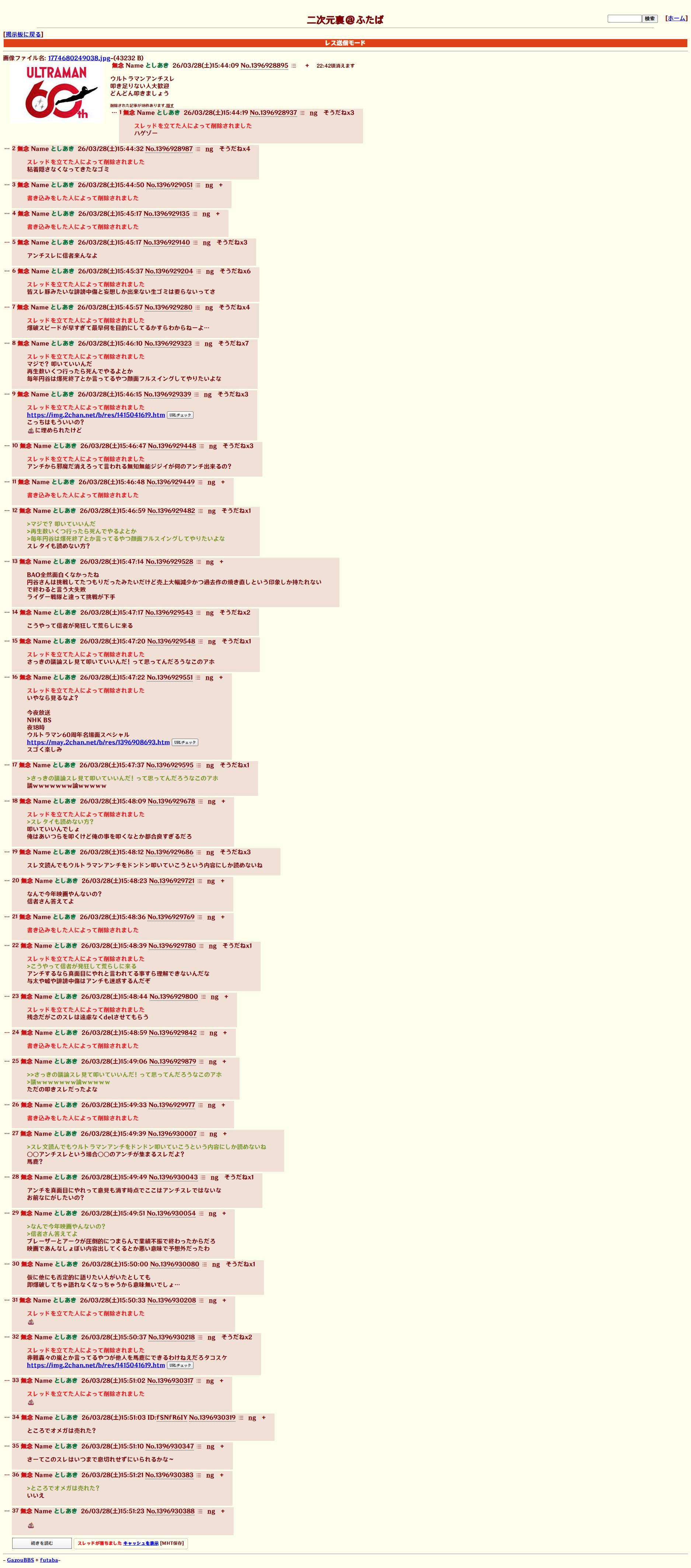 | … | 7926/03/28(土)16:22:35No.1415054093+mayのIPウルトラスレがすぐ消えたんだがこれはいったい |
