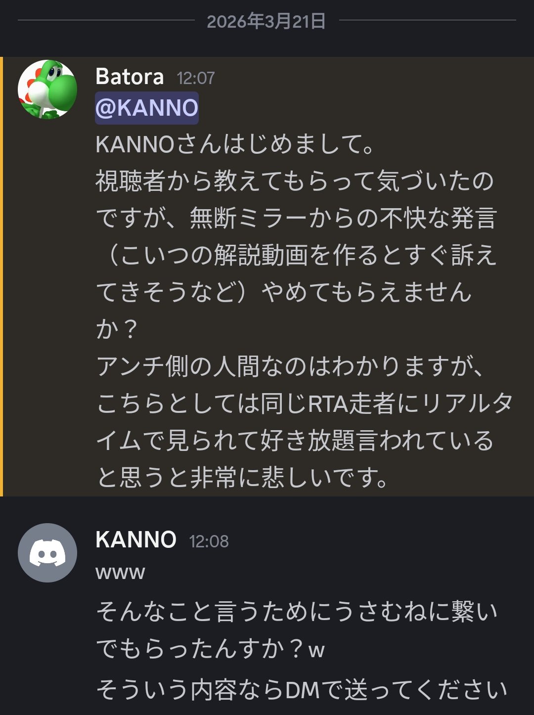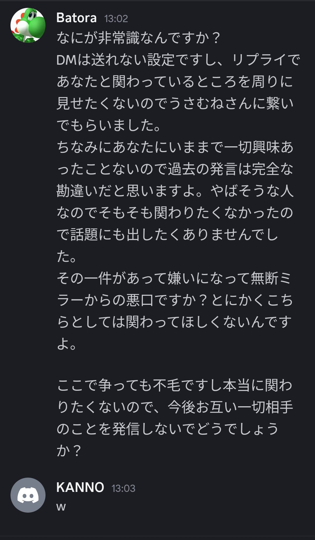 | … | 7026/03/28(土)20:56:07No.1415140216+kanno側も無断ミラーして悪態ついてる時点で被害者面する権利ねえだろ |