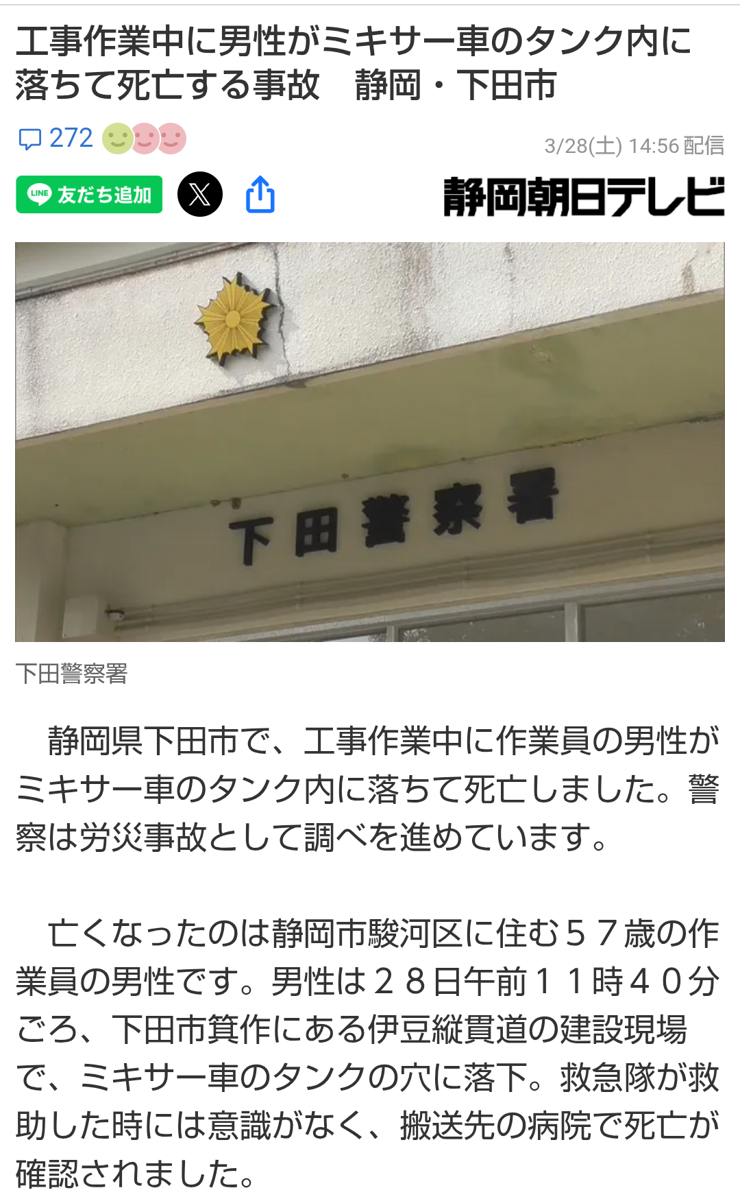 警察によりますと、男性は同僚と2人でトンネル工事の際に必要な粘性の材料を作るためにミキサー車を稼働させていて、肥料や木くずなどをタンク内に入れる作業をしていたということです。
