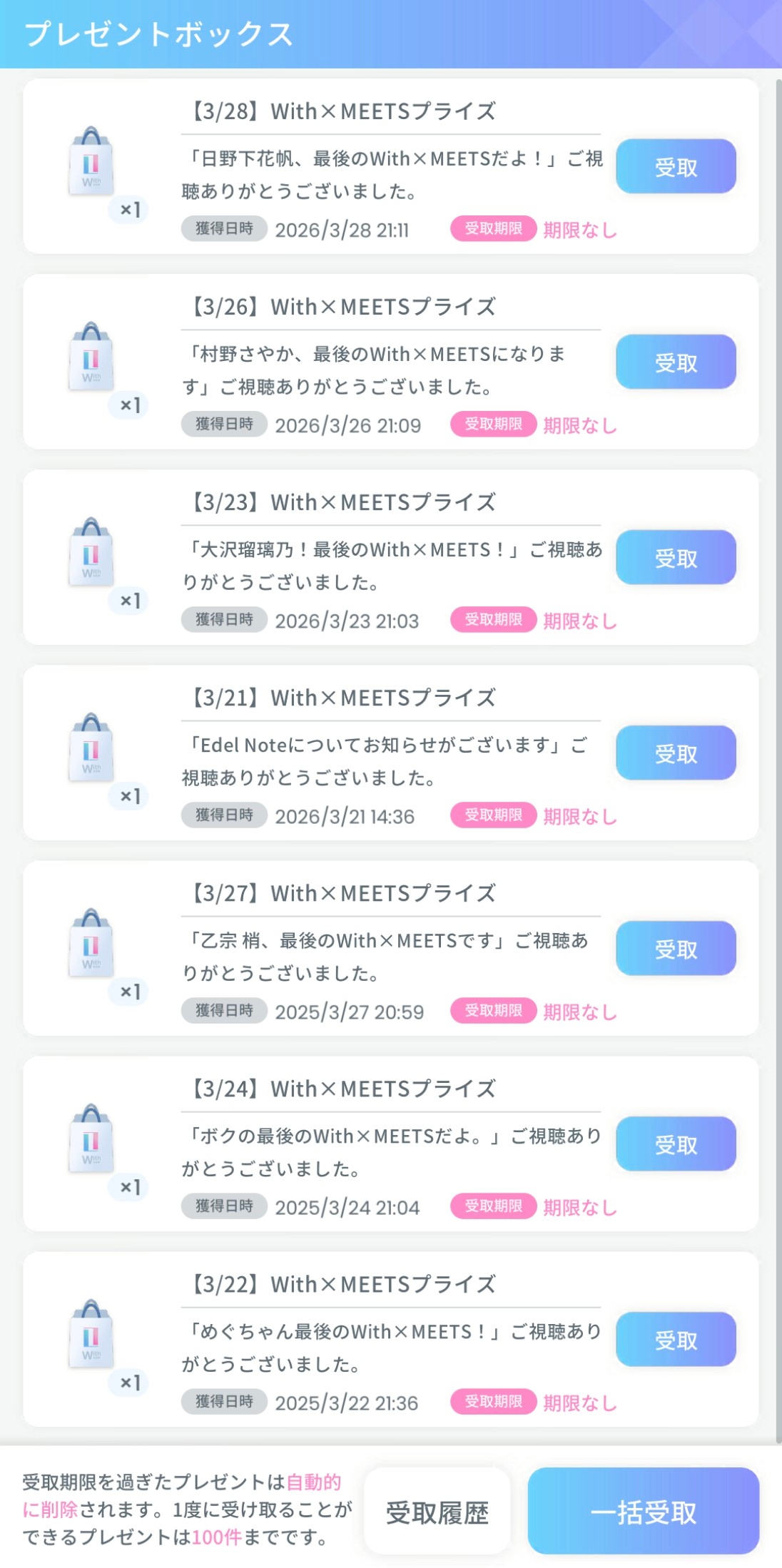 | … | 1426/03/28(土)20:28:50No.1415128662+106期のことが何も発表されていないので本当に最後のWith×MEETSの可能性も… |