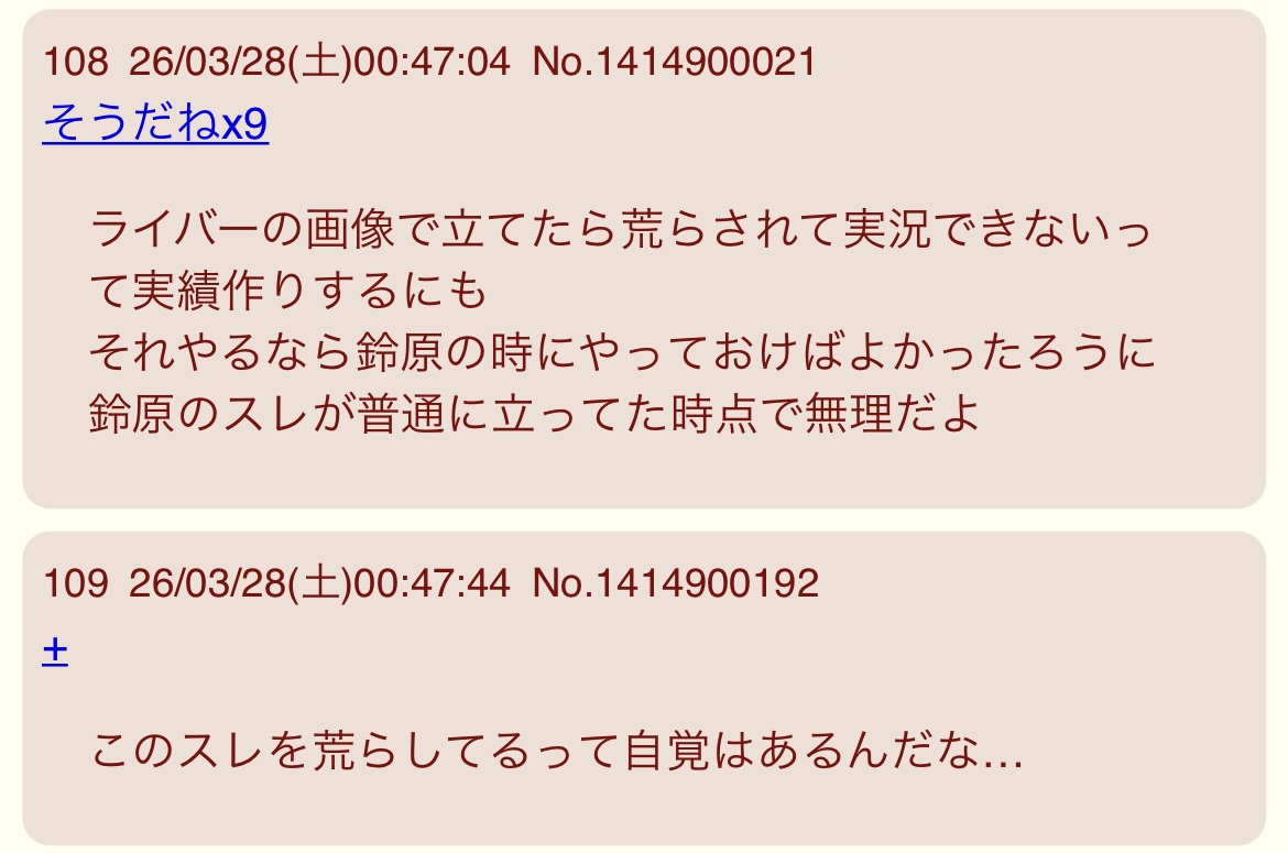 | … | 5526/03/28(土)22:21:46No.1415179277+>荒らされてるってアピールするくせに全く実況もしないしコピペも来ないスレを貼ったら君側に都合悪いトォうんだけど大丈夫そ? |