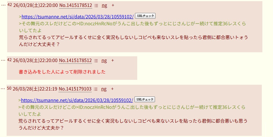 | … | 2626/03/28(土)22:15:15No.1415176452+>あからさまに粘着が立てたスレで実況するわけないじゃん… |