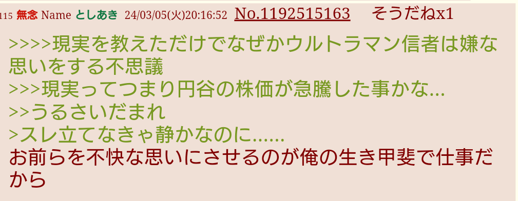 | … | 7026/03/28(土)23:08:10No.1415197297そうだねx1>盛り上がってるのはアホなウルトラ信者だけだろ |
