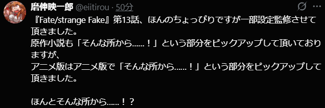 | … | 6826/03/29(日)00:09:49No.1415220239そうだねx1エルメロイ教室自体作品として動かすという話だとFake初出キャラみたいなもんだからな |
