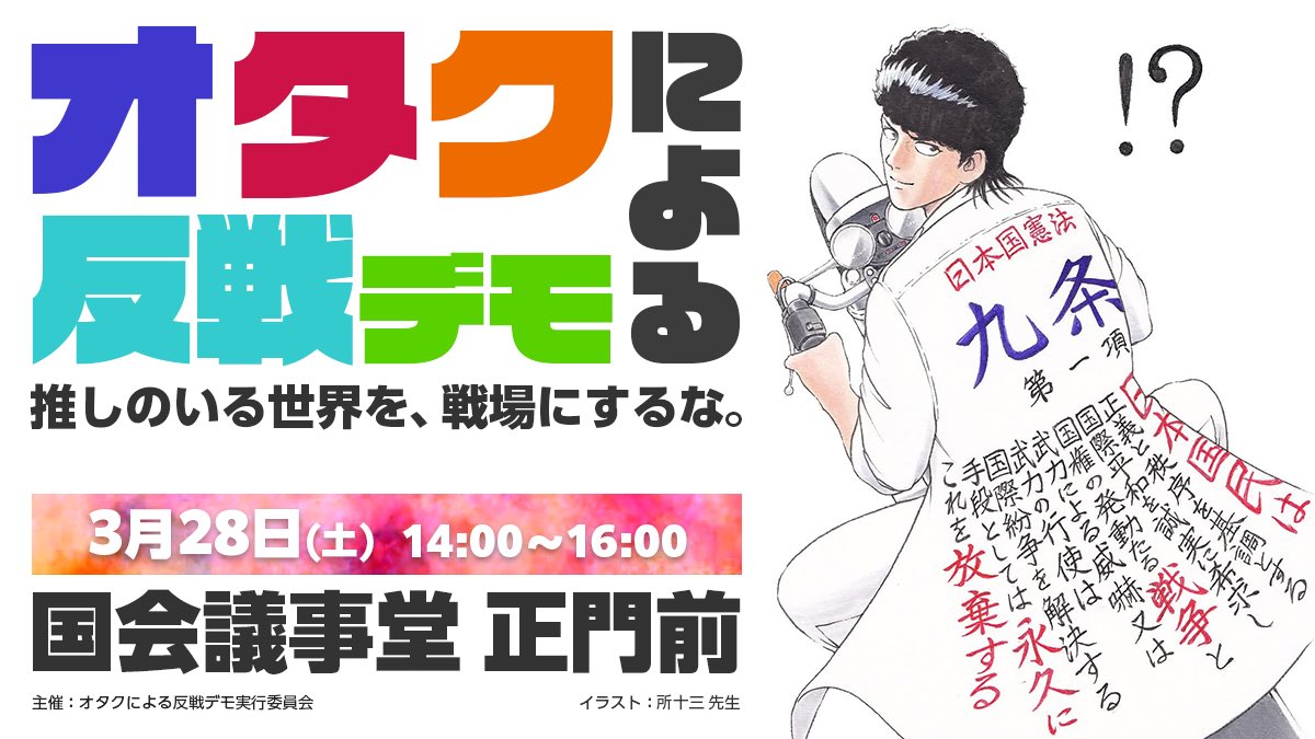 | … | 23226/03/29(日)07:42:27 ID:Vy2Hm4DcNo.1415276737+>>とりあえずデモ参加してないやつはオタクじゃないとか言い出すだろうから楽しみ |