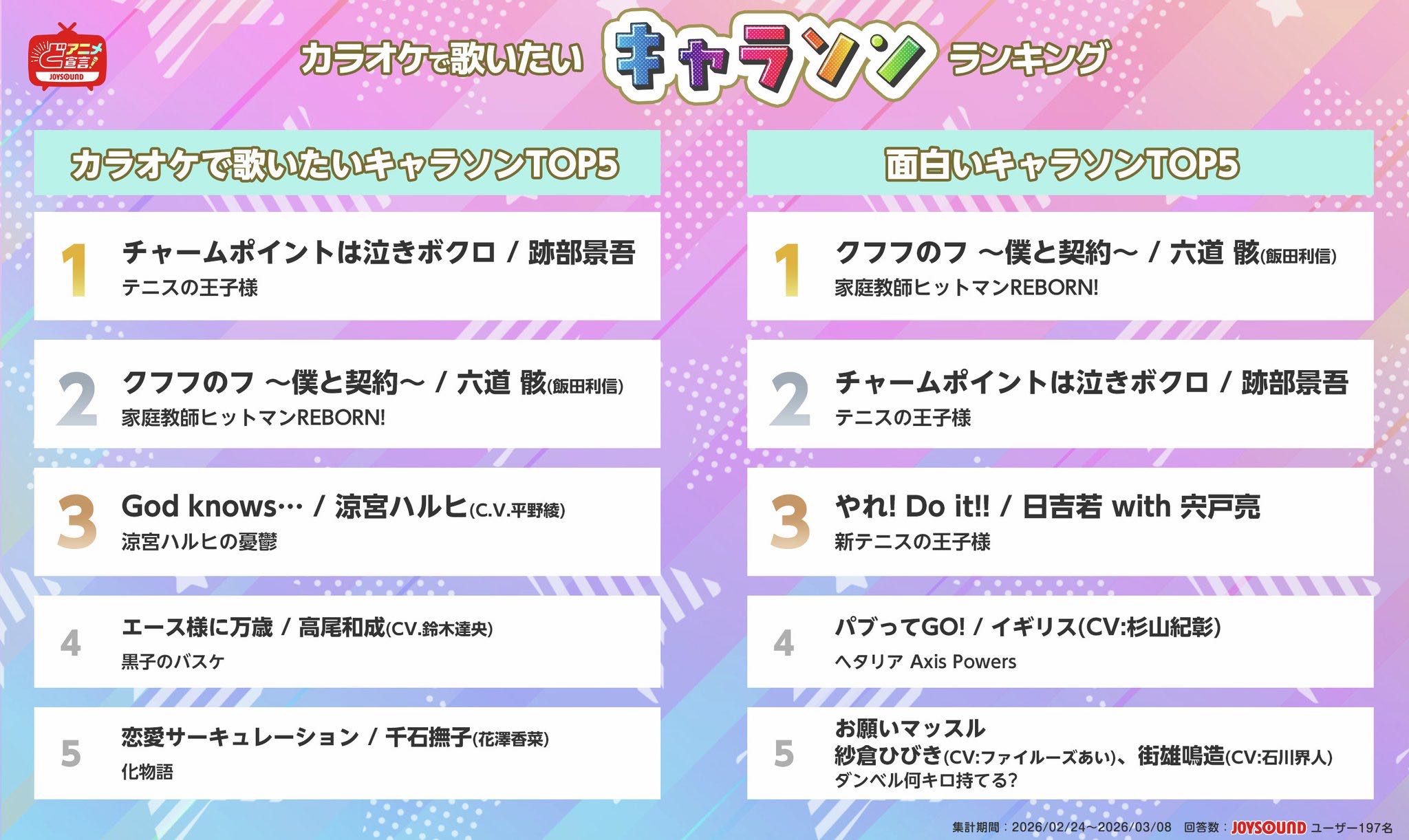 | … | 3426/03/29(日)09:52:58No.1415305630+カラオケに来て歌いたいキャラソンは?って聞いて回答する層ならこんなもんだろ |