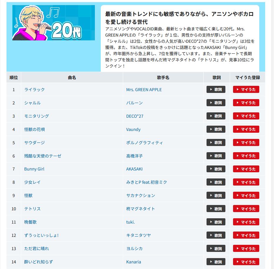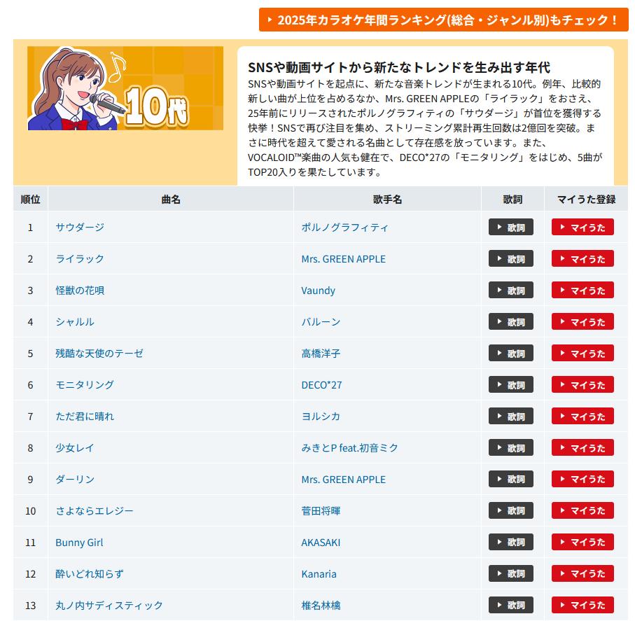 | … | 15126/03/29(日)10:45:11No.1415317544そうだねx1>https://www.joysound.com/web/s/karaoke/feature/annual_age_2025#jp-page-sl-list02 |
