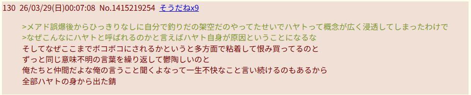 | … | 4026/03/29(日)16:16:16No.1415412876そうだねx2スレに乗り込むと秒で隔離されるので赤字になってからそーっとレスをするチキンがハヤト |