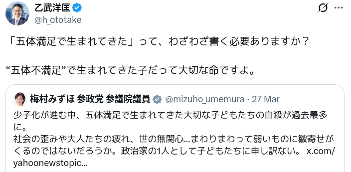 | … | 1226/03/29(日)16:01:59No.1415409124+乙武さんに産まれてこなかった子は大切な命じゃないんですか?でもう一つコンボ入れられるな |