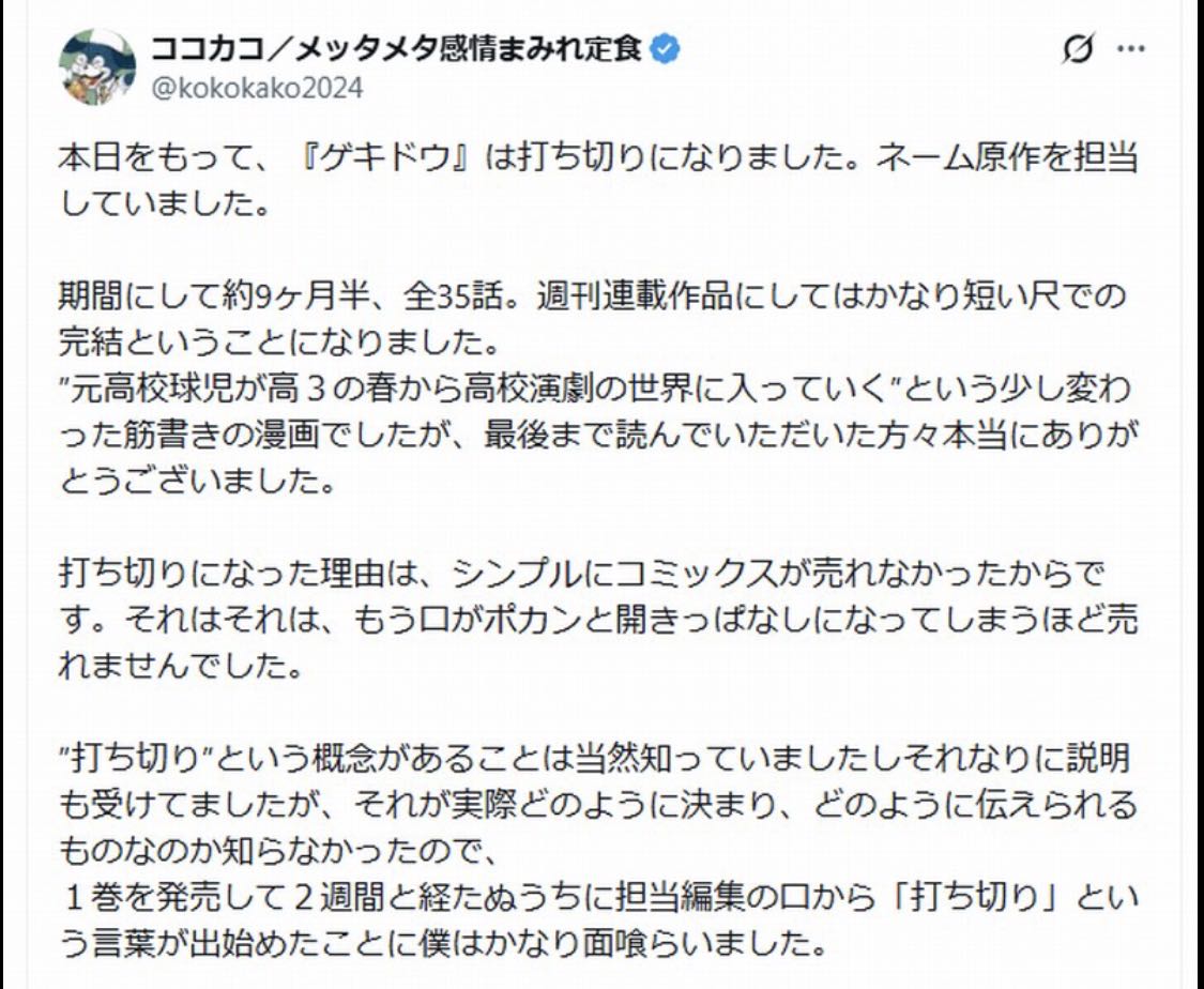 | … | 926/03/29(日)19:34:51No.1415482847そうだねx5売れなかったから打ち切られて面食らいました…って何伝えたいのかよく分からんツイートだな |