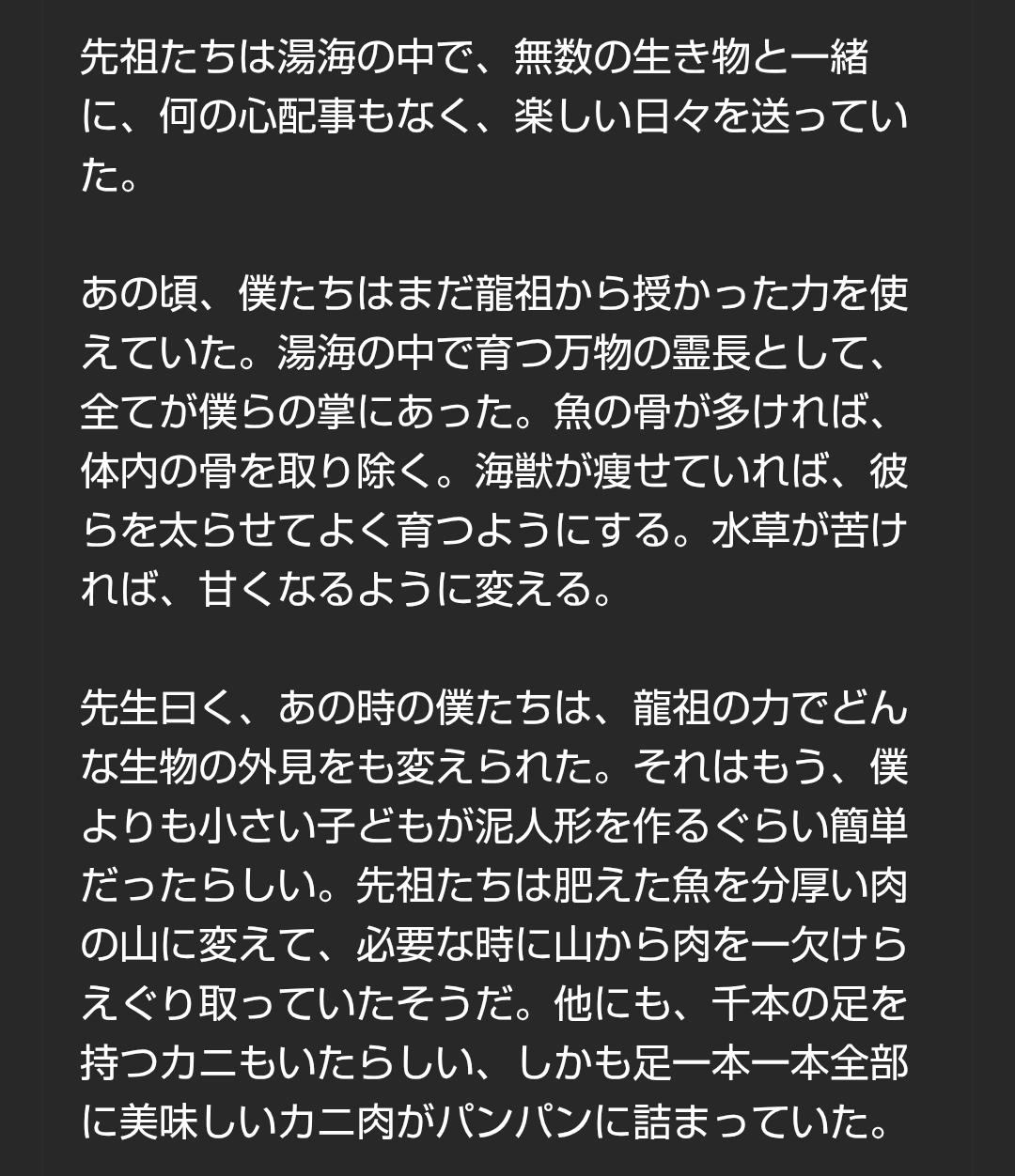 | … | 5626/03/29(日)23:57:31No.1415594220そうだねx1洛星産の人類が芽生えたところもさらっとおとぎ話風にされてたりで真相はまだありそうだ |