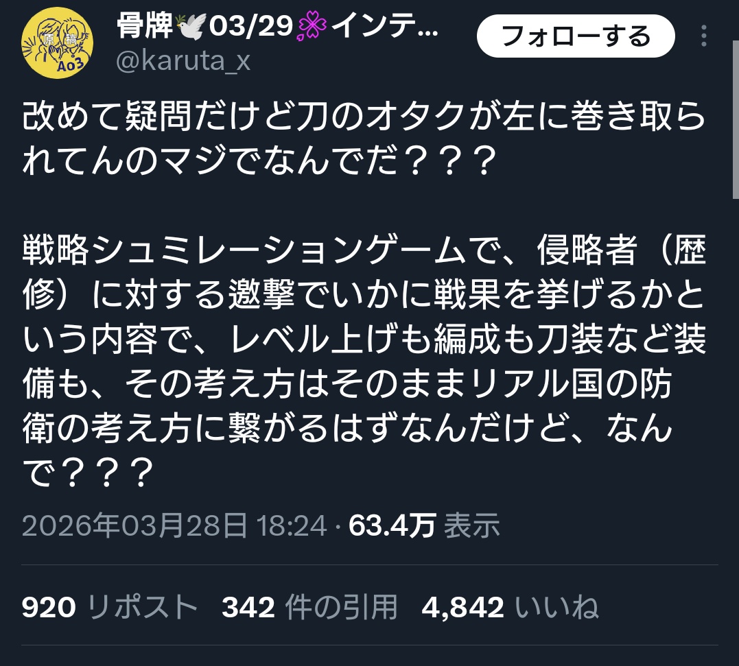 | … | 2826/03/30(月)02:07:50No.1415623254そうだねx4この人は国防とか政治よりも前に刀剣乱舞に対する認識を改めた方がいいと思う |