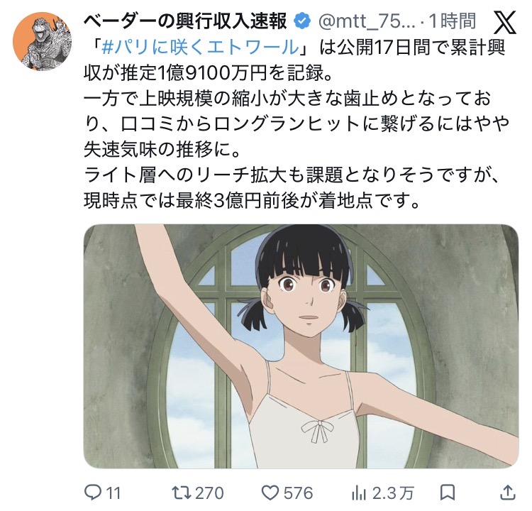 | … | 8026/03/30(月)13:40:21No.1415706985そうだねx10プペル馬鹿にしてるけどそのプペルの初週の興行収入ってもうパリエトの累計超えてんだよね |