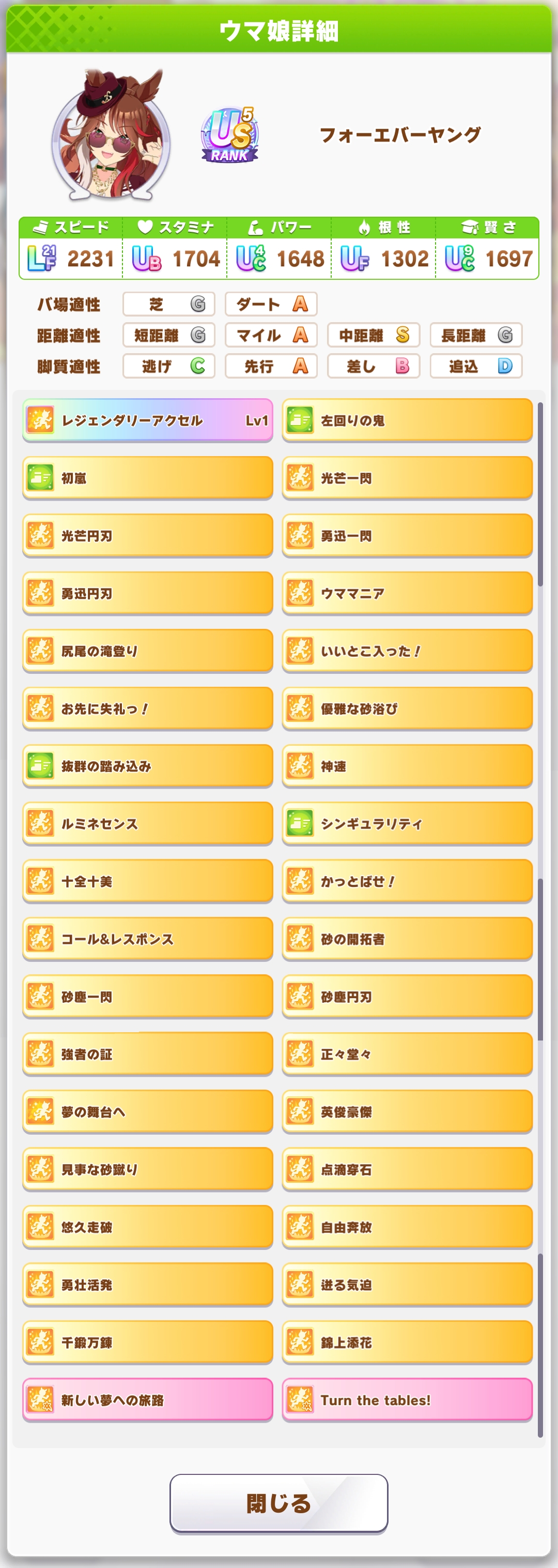 | … | 2426/03/30(月)14:19:39No.1415714732+>現状は脚質とか無視してとにかくスキポ伸びるサポカと切れ者でいらないスキルまで取りまくるハリボテ |