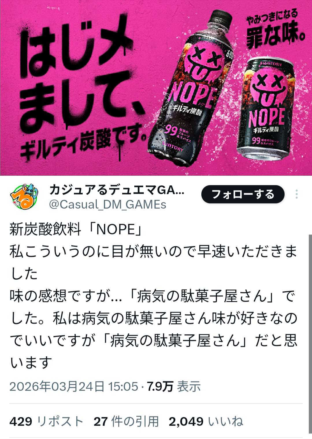 | … | 8226/03/30(月)16:29:10No.1415740183そうだねx1クラフトコーラはマッズまた買ってやるよって感じだったけどこれは1回で満足したよ |