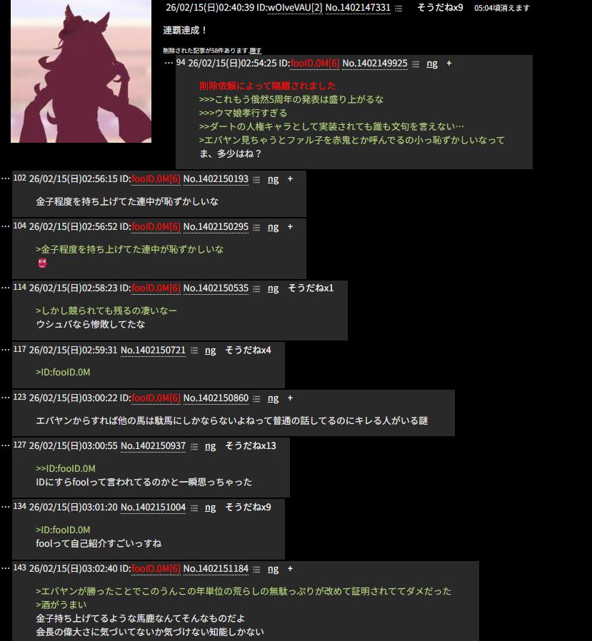 | … | 32226/03/30(月)18:41:53No.1415771976そうだねx4>ウマ娘をこの掲示板で語れなくしたいが一応目的ぽいよ |