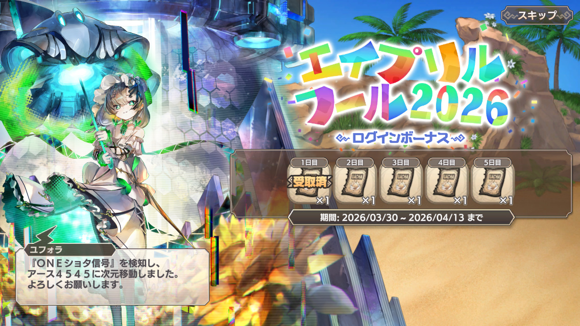 | … | 9026/03/30(月)18:30:33No.1415768812+>4月1日には【ルルイエサーフ】ネオンがガチャ入りするのだわ! |