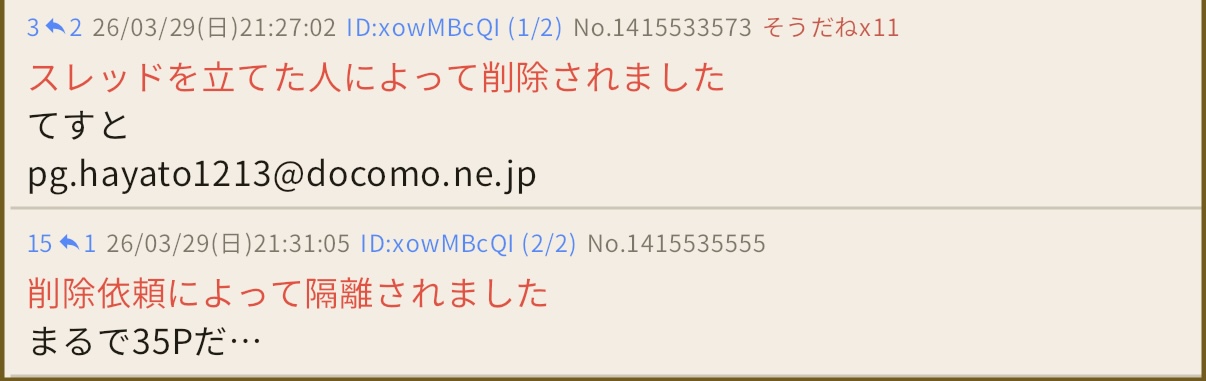 | … | 626/03/30(月)20:03:58No.1415799173そうだねx7そもそもが存在しないメアドで盛り上がったMDユーザーがおかしいわけでな |