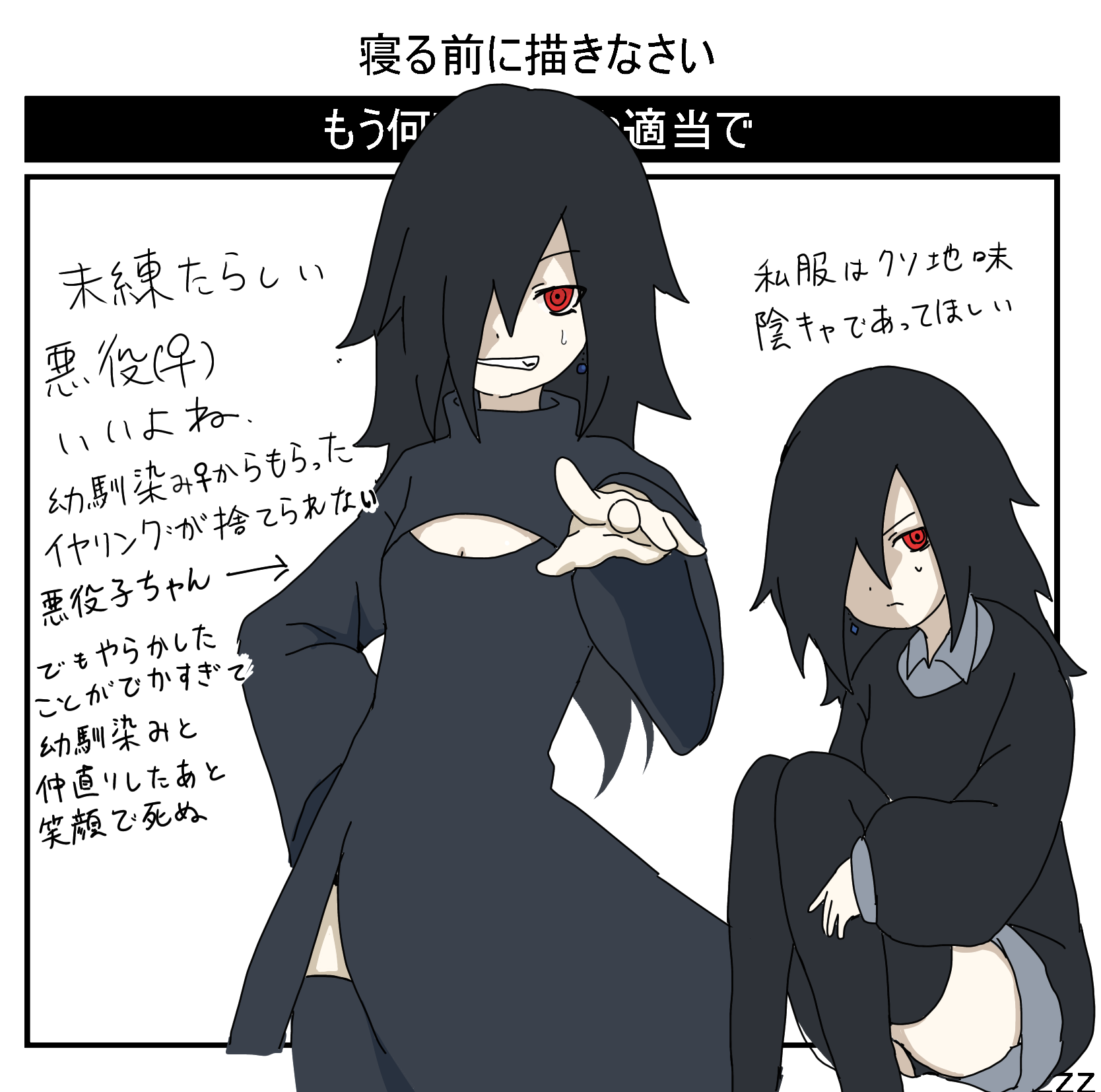 | … | 3726/03/30(月)22:25:16No.1415862879+なんで赤目でボサッとした片目隠れのロングにしてしまったんだ |