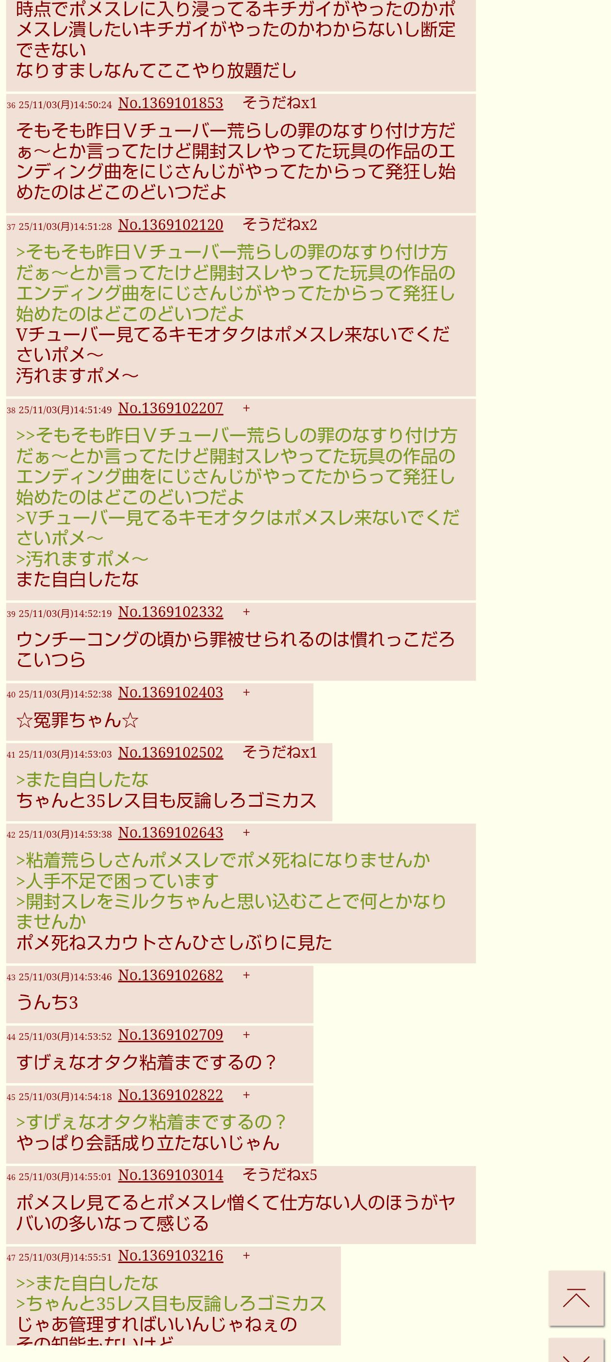 | … | 4226/03/30(月)22:45:29No.1415872226+普段Vに粘着してる時はやっぱりコピペ頼みなんだなって感じ |