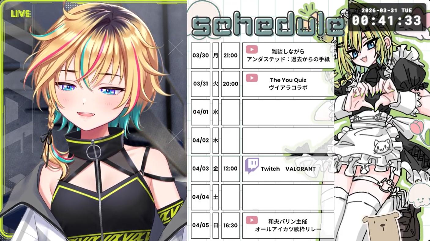 | … | 1926/03/31(火)00:08:24No.1415906882+久々の3人の合同配信楽しみね |