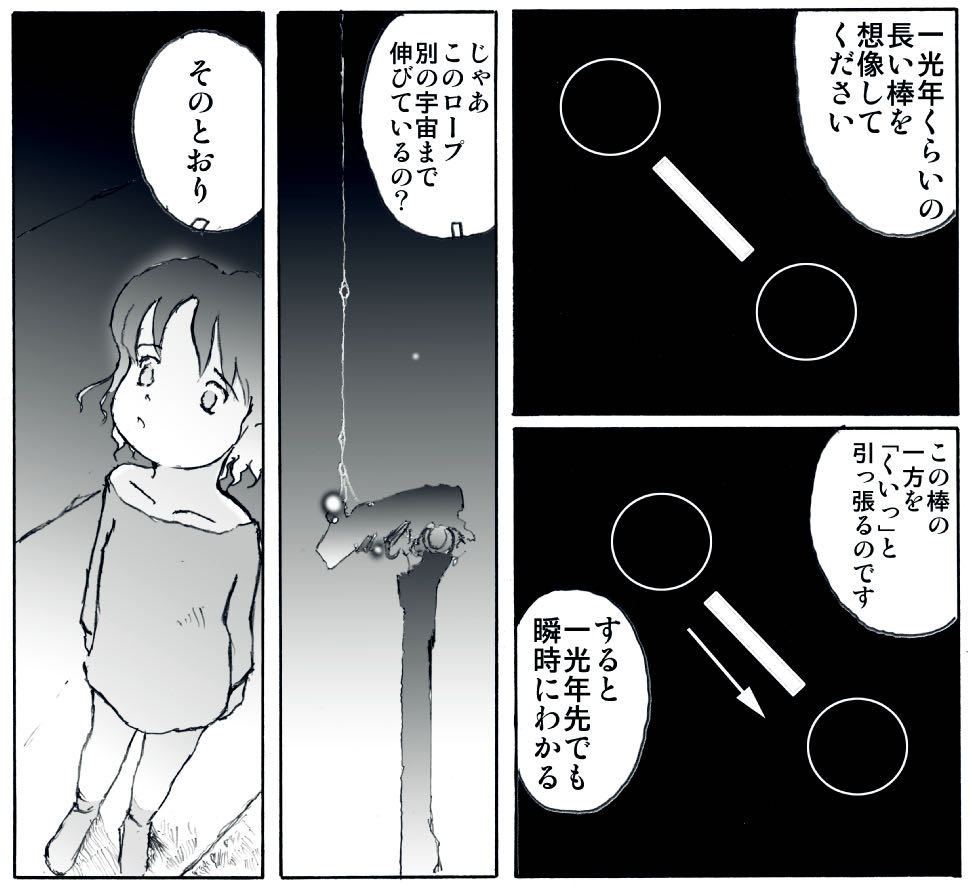 | … | 19626/03/31(火)14:02:26No.1416018868+100光年離れて繋がる棒を小刻みに回転させて瞬時に情報を送るなんてできるわけねーだろうって大石まさるの漫画でやってたけど正しかったんだな… |