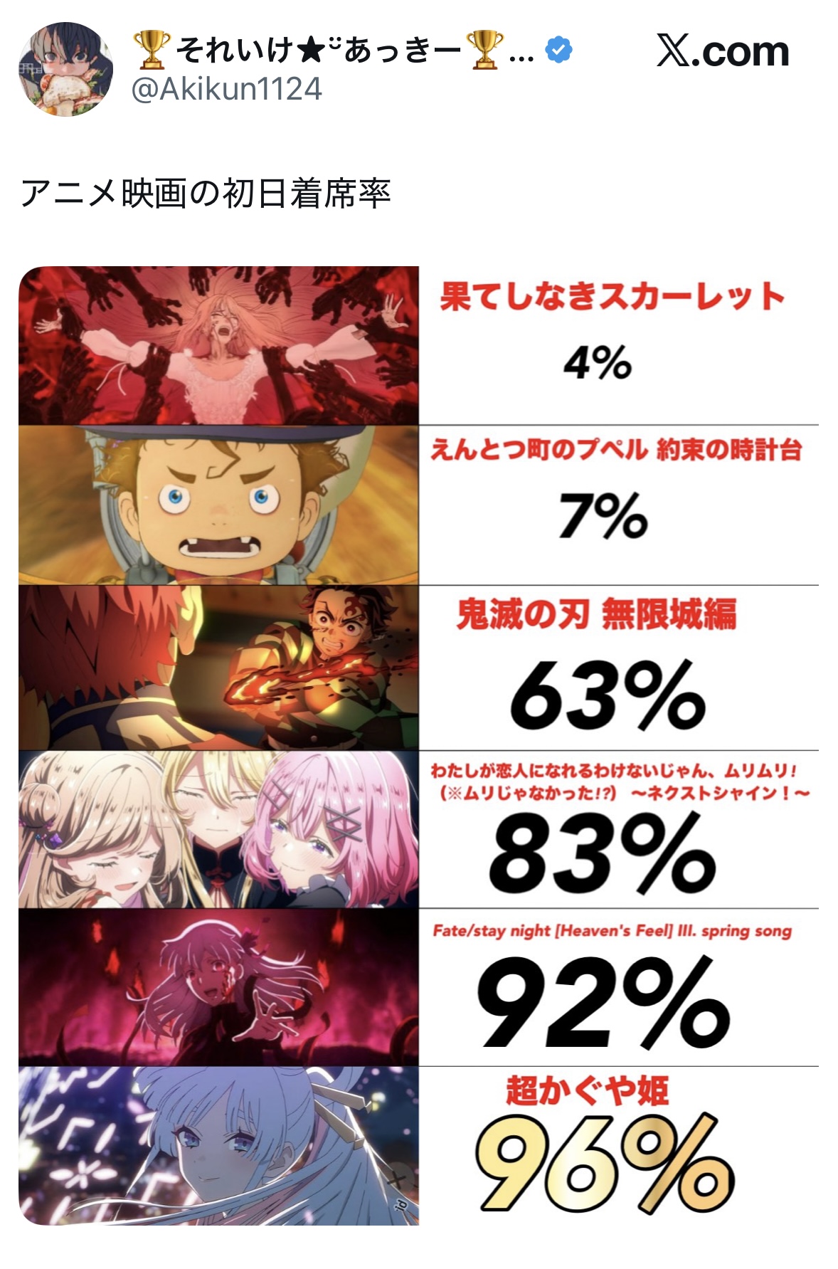 | … | 4126/03/31(火)16:20:50No.1416046256そうだねx7スクリーンの数を勘案すると土曜だったとはいえ初日83%埋めてるFILM REDとバカみたいな上映数用意して初日63%埋めた鬼滅がぶっちぎりでイカれてると思う |
