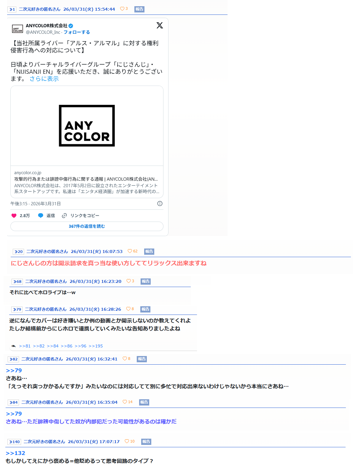 | … | 2726/03/31(火)18:03:38No.1416072118+>あにまんに逃げ込んでホロアンチやってるって前聞いたけどほんまなんやね |