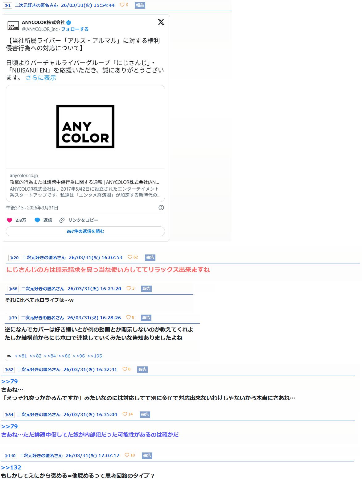 | … | 2026/03/31(火)22:09:37 ID:awhuAcCQNo.1416163075そうだねx13>あにまんでにじ豚がホロアンチしてるのバレたから隠さなきゃあアアアアアアアアアアアアア |