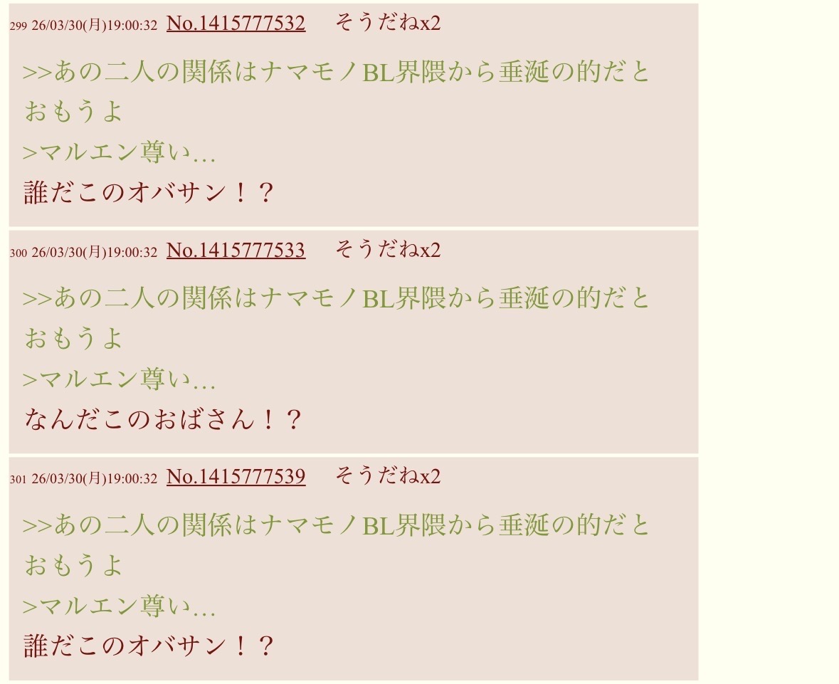 | … | 1826/03/31(火)22:12:11No.1416164037そうだねx4マルエン尊い… |