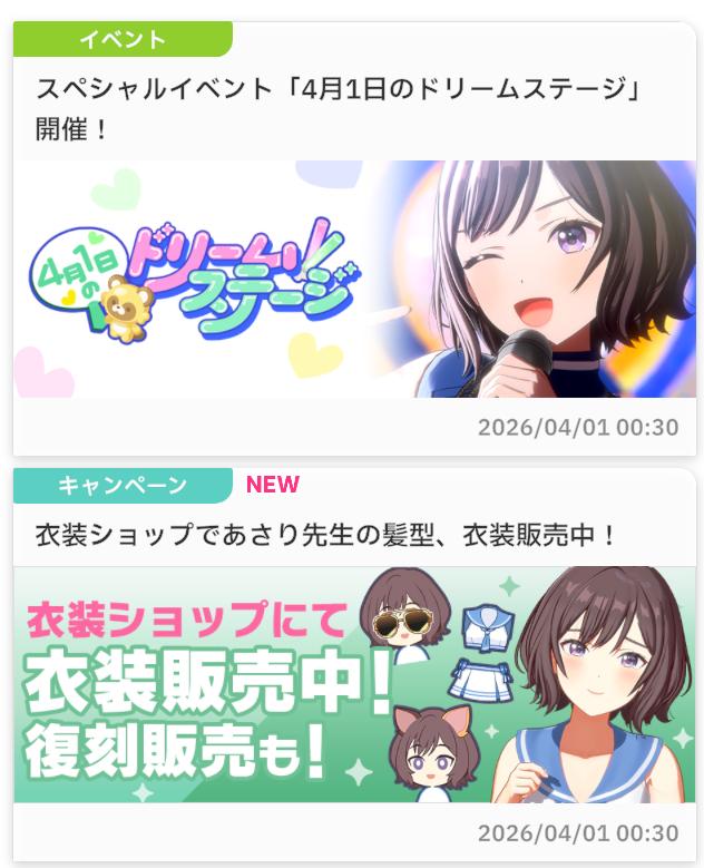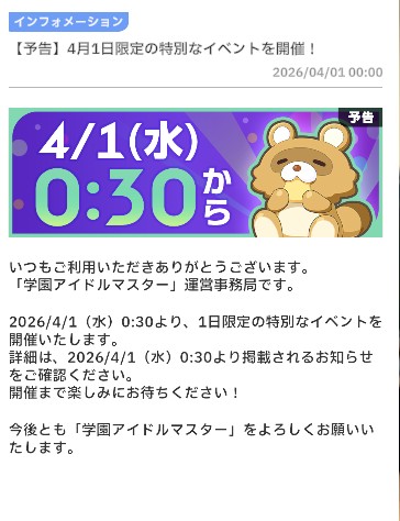 | … | 3426/03/31(火)23:59:50No.1416201287+>流石に去年悪魔が暴れすぎたから学マスのエイプリルフールは1日延期しても驚きませんわ 咲季さんと被るので4/3にしますわ |