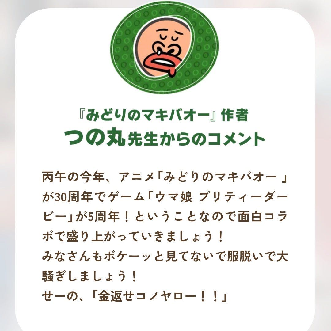 | … | 7326/04/01(水)00:09:52 ID:I9XuHuiINo.1416205148そうだねx7>丙午の今年、アニメ「みどりのマキバオー 」が30周年でゲーム「ウマ娘 プリティーダービー」が5周年!ということなので面白コラボで盛り上がっていきましょう! >みなさんもボケーッと見てないで服脱いで大騒ぎしましょう! >せーの、「金返せコノヤロー!!」 つの丸先生からのコメントです |