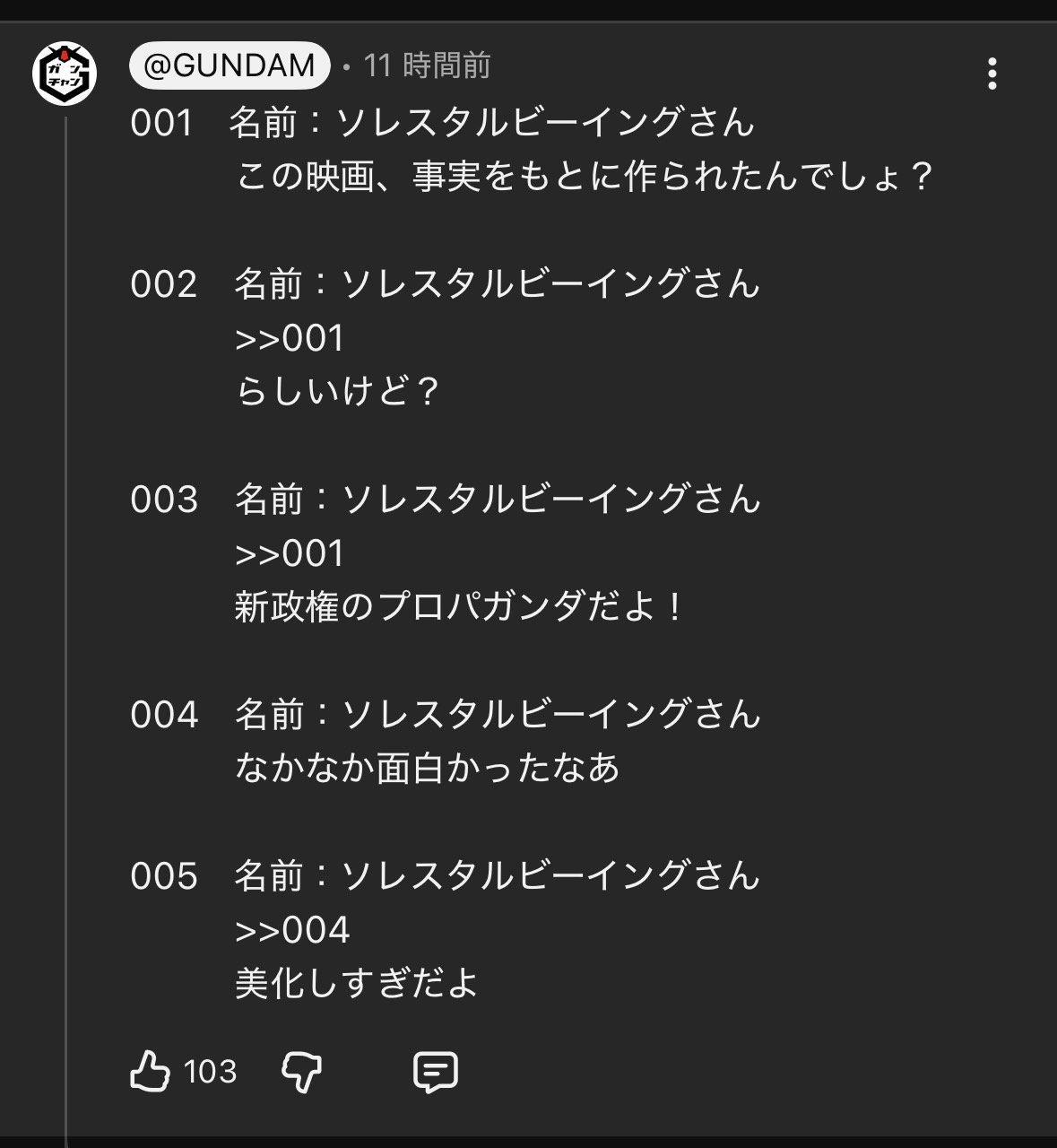 | … | 16126/04/01(水)01:42:31No.1416229953そうだねx1政府のプロパガンダだったとしてもただのエンタメだったとしても |