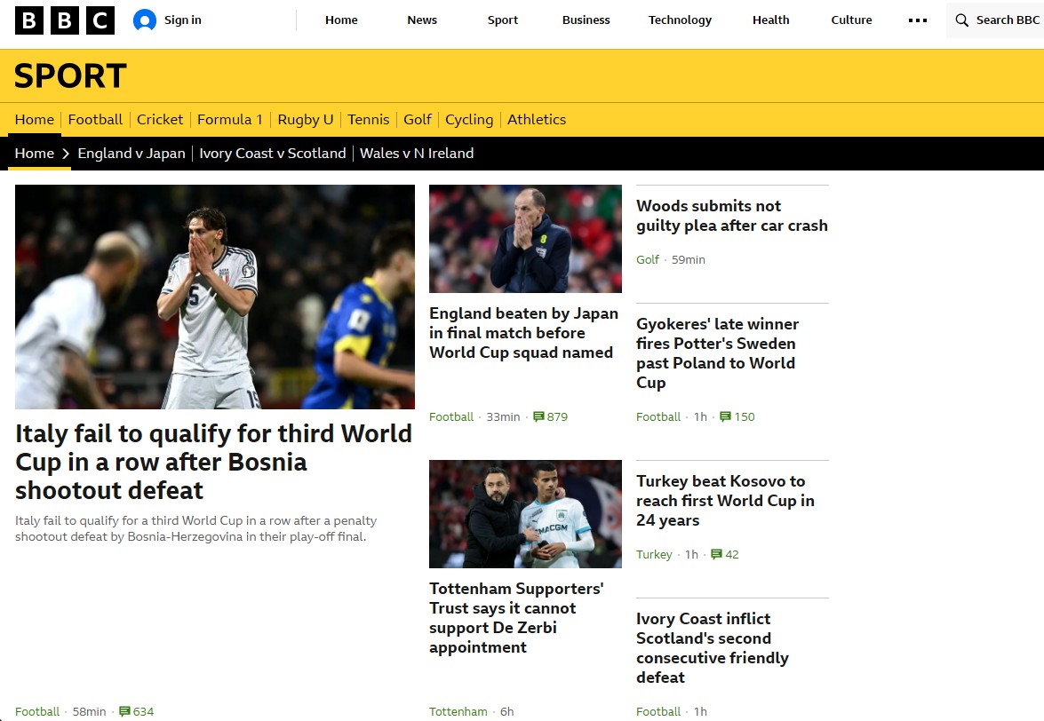 | … | 4926/04/01(水)07:51:21No.1416256789そうだねx7>イタリアの敗退を報じるBBCのwebページ |
