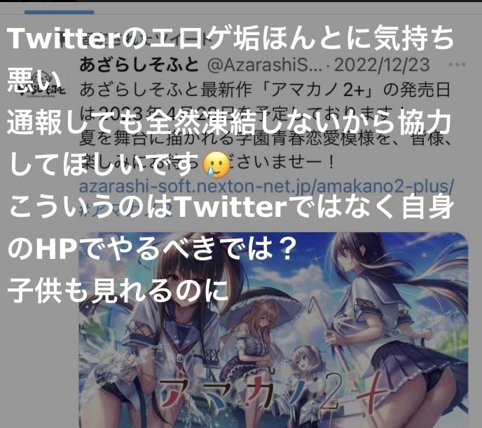 | … | 4826/04/01(水)11:24:26No.1416288007+>直球でエロ画像貼ってるアカウントに比べたらエロゲ垢なんてかわいいもんだろ |