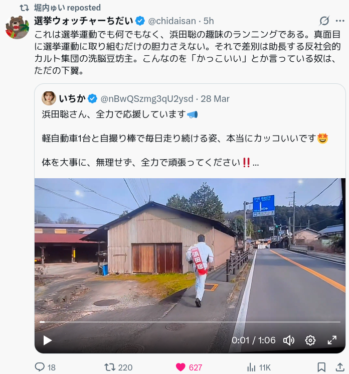 | … | 11626/04/01(水)16:31:30No.1416350187そうだねx3延々と高市粘着してる奴いるけどこういうヤツがやってんだろうなぁ |