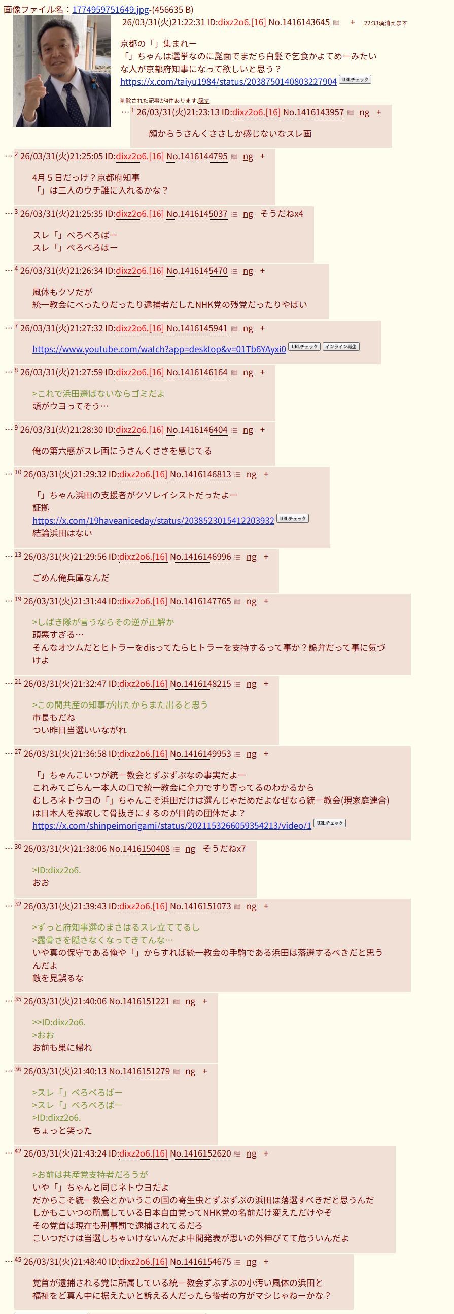 | … | 326/04/01(水)15:36:52 ID:VGykB3XkNo.1416340346+浜田聡は統一教会とずぶずぶだからな… |