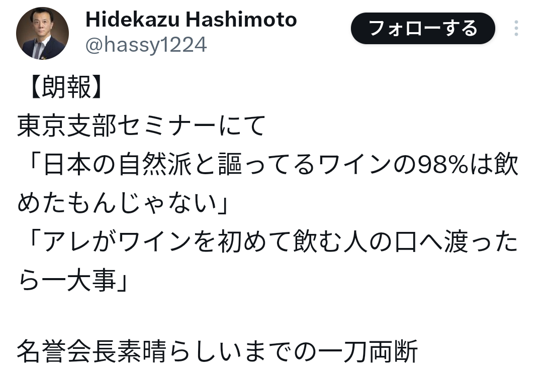 | … | 23726/04/01(水)18:09:14No.1416368299+俺のxにも同じようなのが流れたから読んでみたら どうも日本の自然派の作るワインは不味かったり臭かったり品質が安定してない(けどオーガニックだから価値がある)のが駄目とか書いてあった 酷いやつは腐ったブドウジュースとか言ってるのは流石に誇張だと思いたいが |