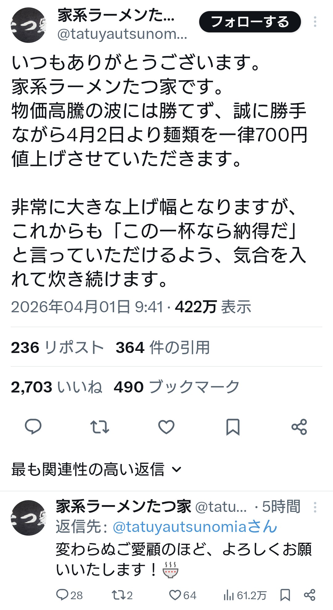 | … | 9726/04/01(水)15:13:48No.1416335994+めちゃくちゃ美味いとか連日行列とかなら700円値上げでも着いてくるかもしれんが… |