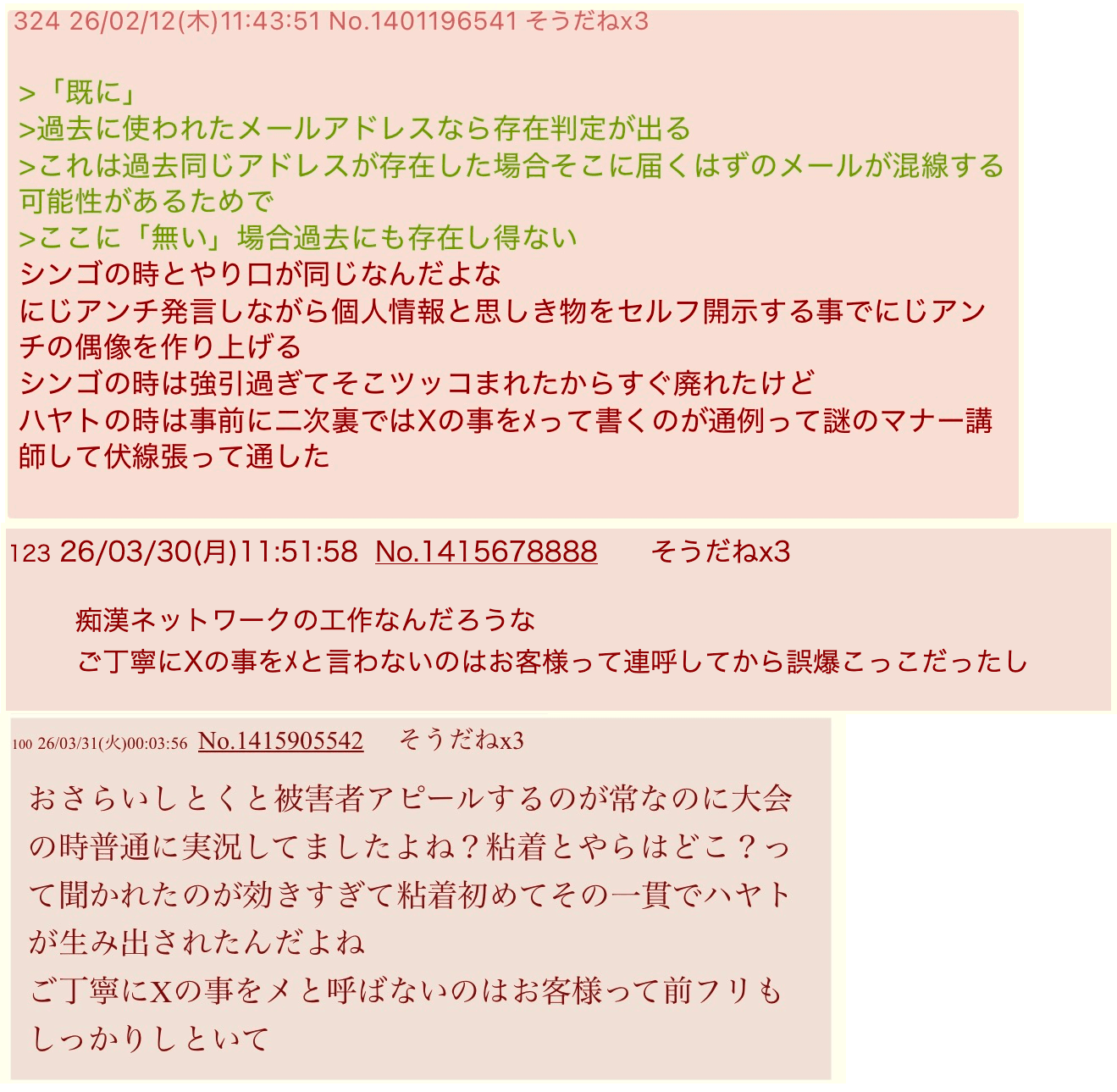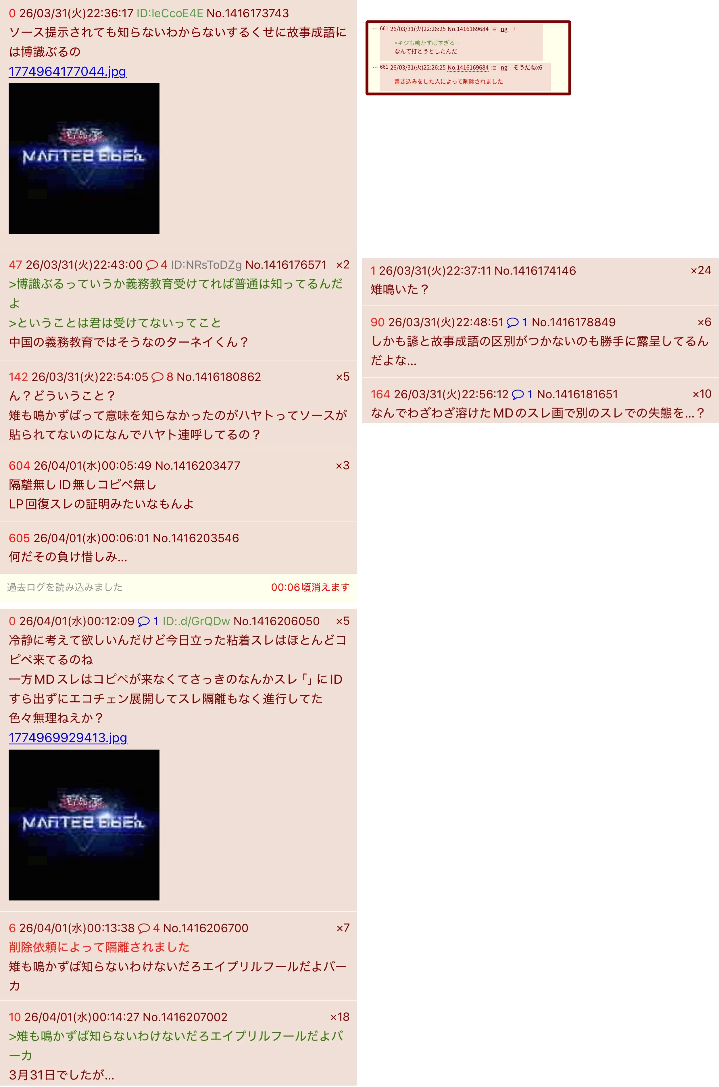 | … | 2826/04/01(水)21:43:33No.1416433685+レス番が青(だっけ?)だから自演バレしてるのは見たことあるし仕組みはわかるけど |