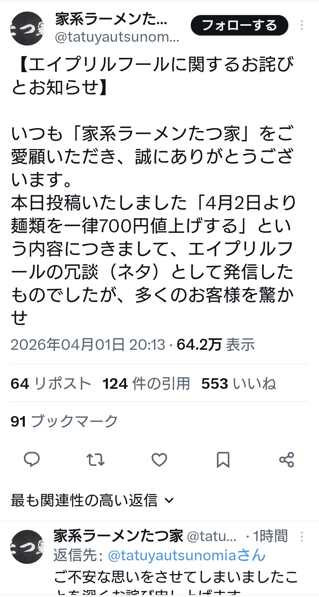| … | 1926/04/01(水)21:40:06No.1416432564そうだねx25ラーメン950円が明日から1650円です! |