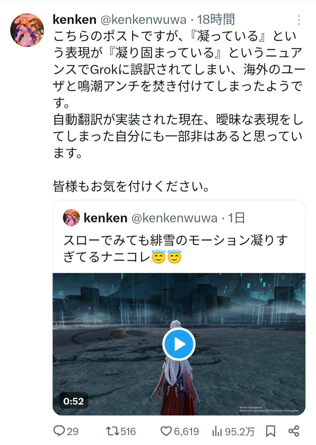 | … | 25226/04/02(木)14:18:24No.1416581401そうだねx1誤訳って訳じゃないんだけど謝罪案件で日本人から海外の人の謝罪を見ると理由→謝罪の順で書かれるのがごめんなさいより先に言い訳してるように見えるし |