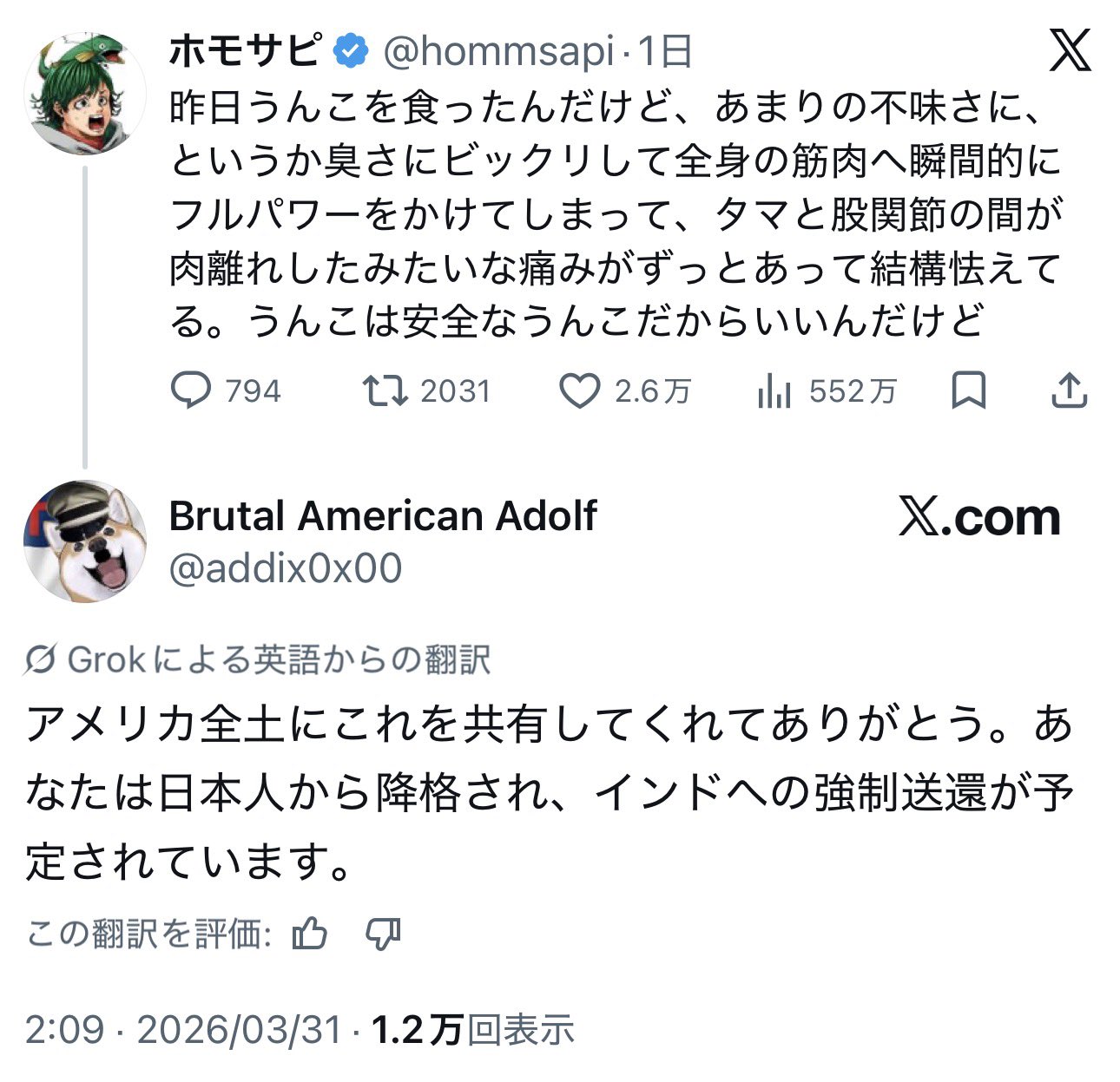 | … | 1826/04/02(木)12:22:28No.1416555217そうだねx15間違いなくかなり近いうちに日本人が機械翻訳で勝手に海外へ大激怒する騒動がメで起きると思う |