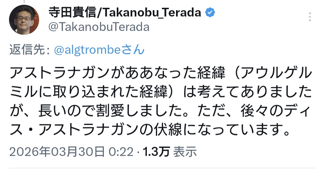| … | 2026/04/02(木)19:38:09No.1416650610+元ゲーム知らんからそこまで愛着はないけどとにかくアストラナガンに関する重要キャラだから退場しちゃったの悔やまれるイングラム |