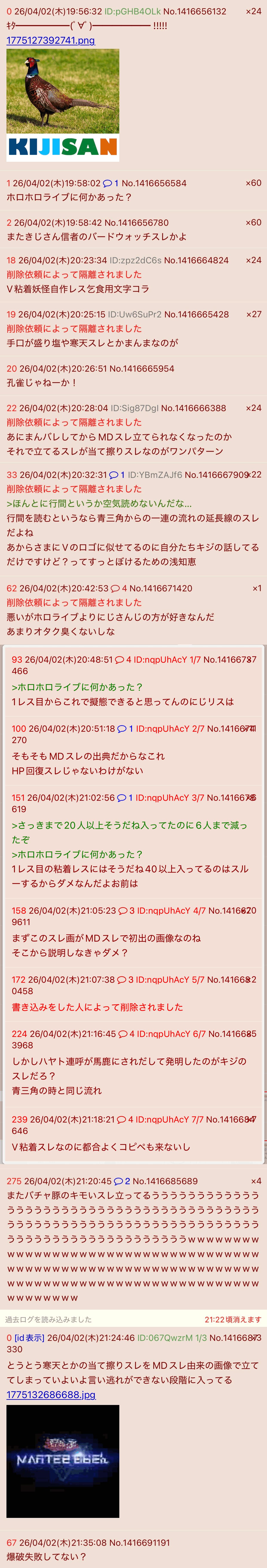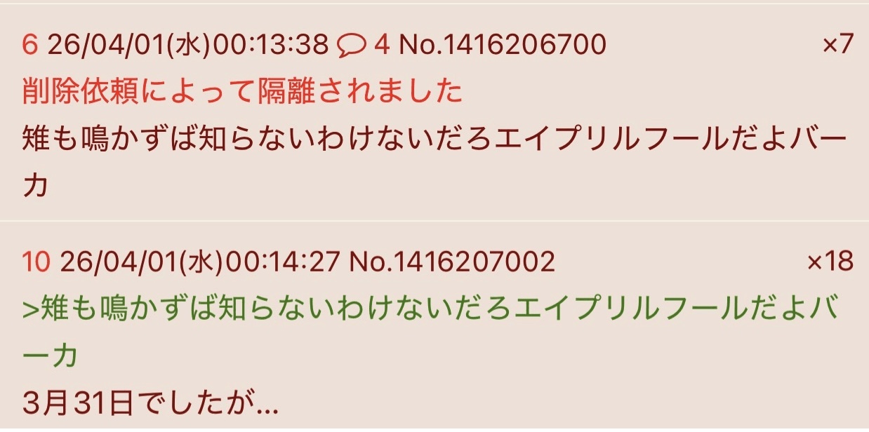 | … | 2026/04/03(金)00:06:17No.1416739772そうだねx10キジもにじリスのやらかしって擦り付けてて戸惑っているのは俺なんだよね |