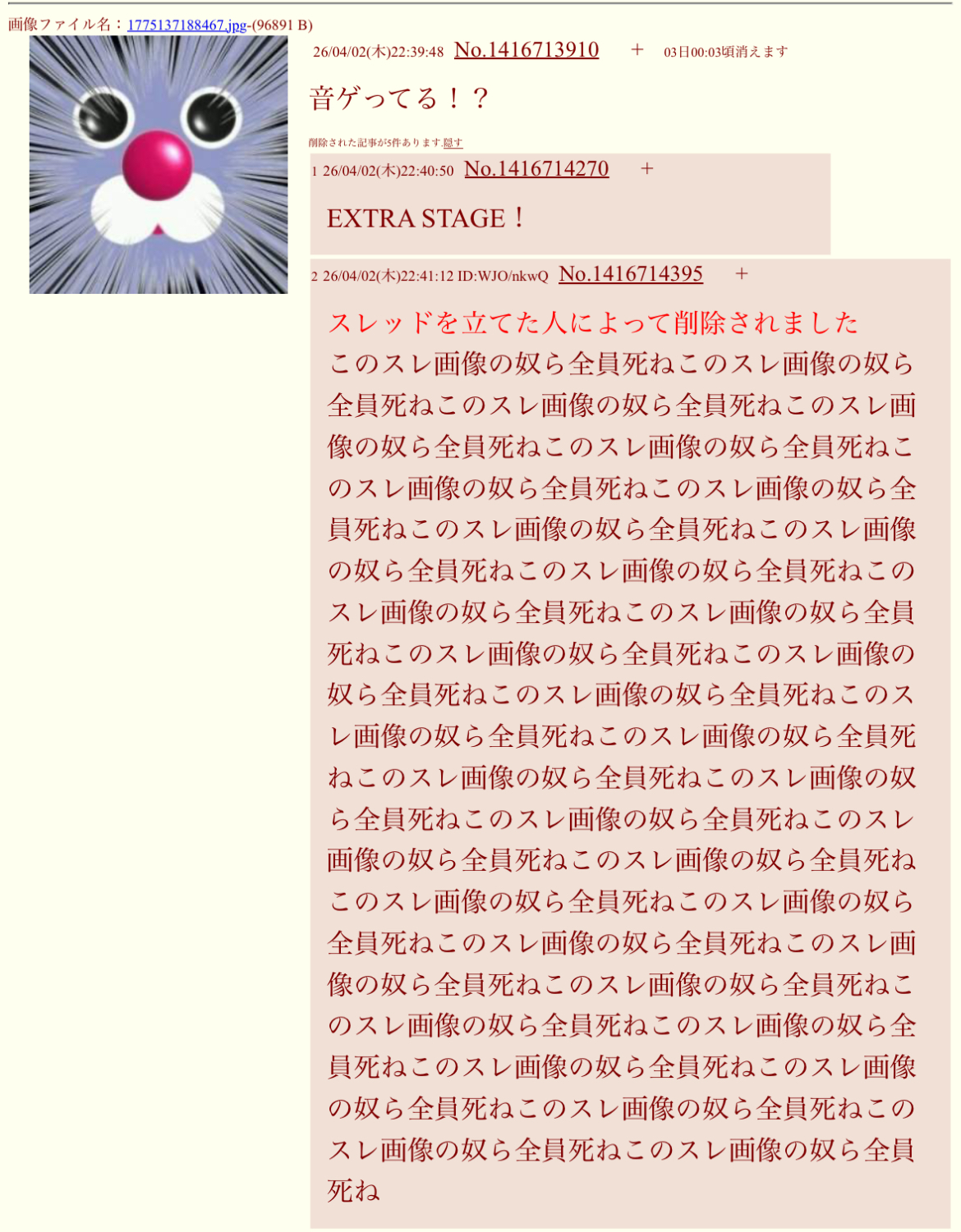 | … | 2026/04/03(金)01:11:38No.1416754960+荒らしのキチゲ解放スレ? |
