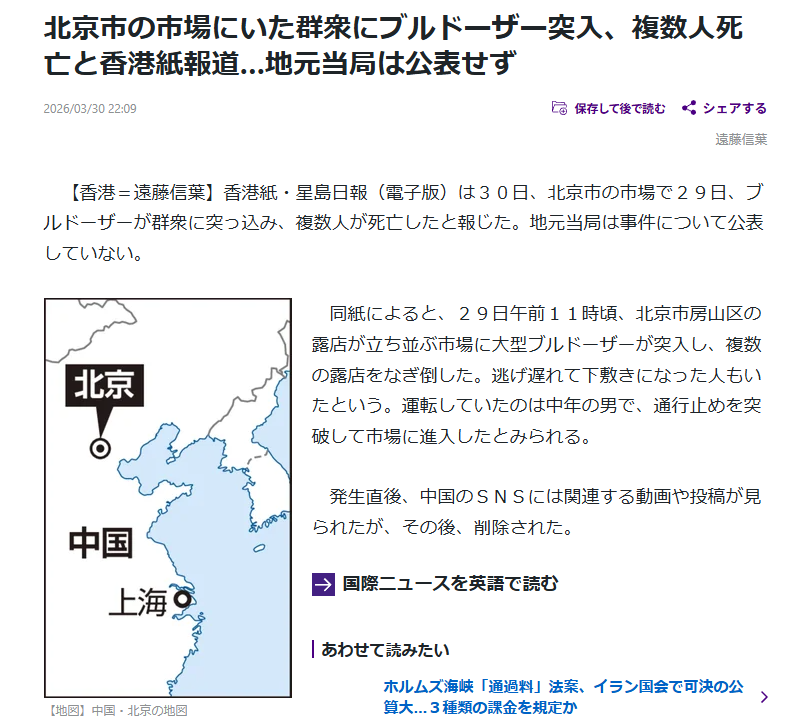 | … | 1826/04/03(金)12:34:46No.1416822302そうだねx1報道しちゃった香港紙が怒られてそう |