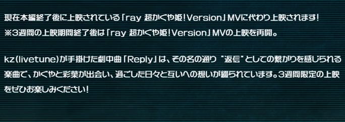 | … | 326/04/03(金)11:14:44No.1416806528そうだねx6>※3週間の上映期間終了後は「ray 超かぐや姫!Version」MVの上映を再開。 |