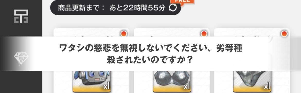 | … | 226/04/03(金)20:12:24No.1416936719+もちろんワタシの慈悲は3セット分揃えましたね劣等種 |