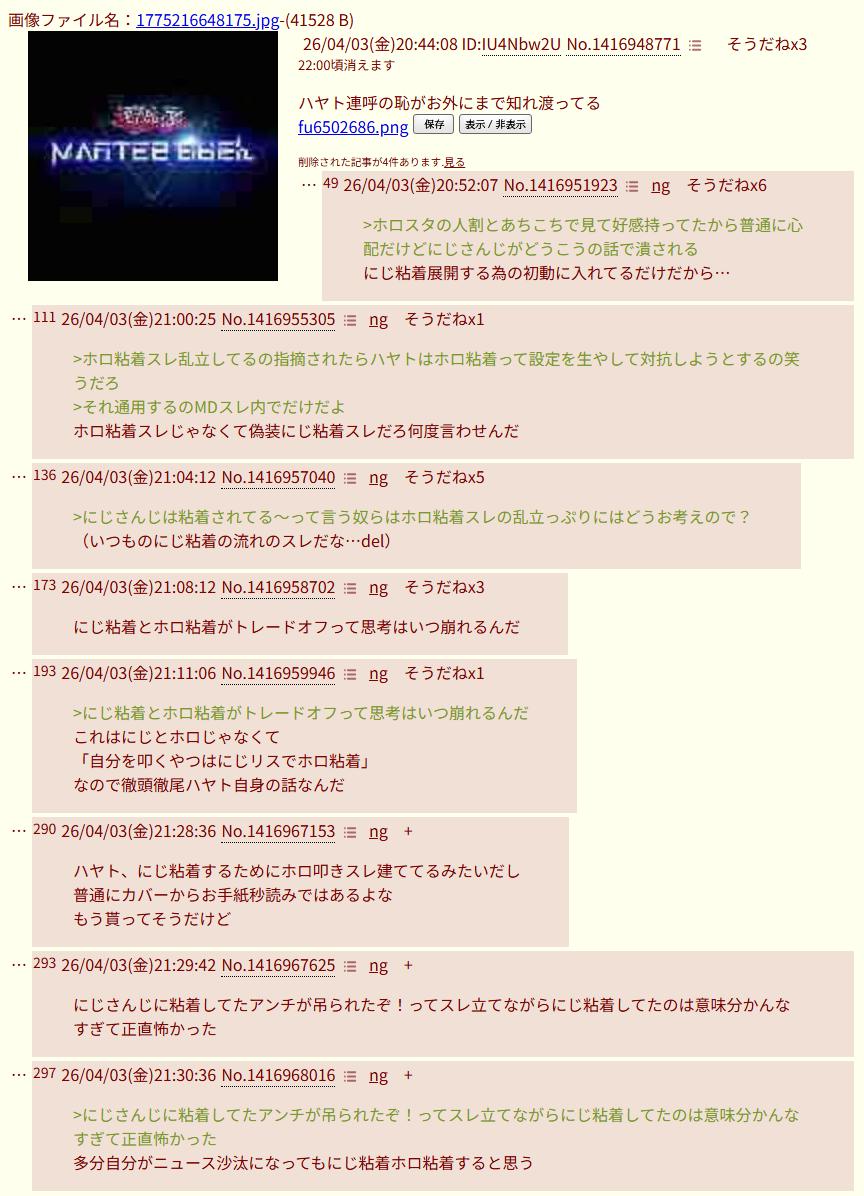 | … | 4226/04/03(金)23:47:43 ID:1fryTXD.No.1417019345そうだねx8>いつものにじ粘着はなーされても止まらない |